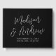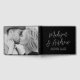 Add a personalized touch to your wedding ceremony with this Simple Black and White Script guest book. The design features your names displayed in an elegant white calligraphy script with your wedding date and location shown below on a black background. Add your custom text to the spine of the black and white guest book. The back of the guest book features your horizontal engagement photo.