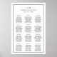 Simple wedding seating chart poster featuring a modern yet elegant design with your two letter monogram, names and date with the chart below, surrounded by a thin border. The template has three columns with twelve tables of eight guests as an example, but can be customized for your number of tables and guests. A chic and stylish black and white design that is great for a minimalist couple.