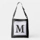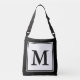 A large black monogram is inside a white square. The monogram has a black and white border. You can customize the black and white crossbody bag with the correct initial.