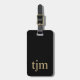 Simple elegant customizable luggage tag design with black background, golden bold monogram.