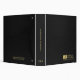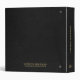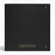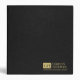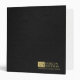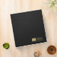 Whimsical, minimalistic law office design with a custom monogram on a gold square and custom text in gold tones. Black leather texture image background.