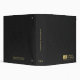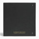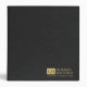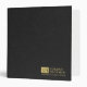 Whimsical, minimalistic law office design with a custom monogram on a gold square and custom text in gold tones. Black linen texture image background.
