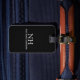Modern luggage tag featuring a simple and minimal black design with your monogram in a bold font along with your name on the front. The back has your contact info.