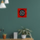 A bold black shape filled with evenly spaced white ovals is set against a vibrant red background. The simplicity and contrast create a striking visual effect.