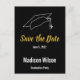 ''Save the Date' for a graduation party with this black, white and faux (not foil) gold postcard. You can personalize with the graduate's name and party date. A graduate's cap is at the top above the text on this black postcard.