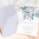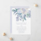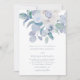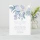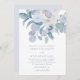 Beautiful muted blue delicate floral wedding invitation features pretty airy blue watercolor vintage style flowers and a simply classic design with elegant calligraphy script typography. The back is classic powder blue.