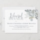 This design features watercolor floral foliage dusty blue, a QR code with map directions for online, rehearsal grooms dinner event, modern elegant calligraphy script font, simple elegant botanical greenery rose, modern simple minimalist typography font, fall winter summer spring style, romantic soft elegance simplistic, web address add your URL, the night before