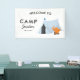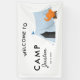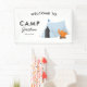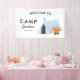 Whimsical birthday party welcome banner featuring a blue tent with a campfire next to it. Customize this product by adding your child's name and event date. Great for camping, sleepover, and outdoor theme birthday party.