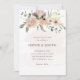 This simple, elegant wedding invitation features a boho rustic bouquet of watercolor flowers and greenery in neutral shades of peach terracotta and ivory, on a white background with a subtle blush watercolor splash.
