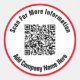 You can replace the website url for your QR code. There are two lines of black display text that you can edit to show a custom message. These stickers have black text in a white circle. The border is bright red.