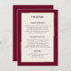 Ce design simple avec une bordure bordeaux est la carte de détails parfaite. Il vous permet d'avoir suffisamment d'espace pour inclure tous les renseignements importants tels que les renseignements sur l'hébergement, le transport et le registre de votre mariage. Les champs de texte sont modifiables pour répondre à vos besoins. Cela donnera à vos invités des informations utiles pour votre jour de mariage.