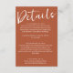 An elegant and simple minimalist boho orange wedding enclosure details card. Which features a minimalist template with burnt orange stylish background. And white whimsical chic DETALIS wording script alone with the customizable calligraphy.