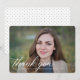 This simple graduation announcement features “graduate” calligraphed on top of your full bleed photo. Underneath, personalize the graduate’s information, school and degree information. On the back, a sweet, coordinating polka dot pattern.