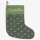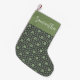 This design features a Christmas holiday green and grey Holiday simple cute stocking with a stylish trendy calligraphy script, a cute simple snowflake snow pattern, minimalist minimal classic classy, an elegance elegant vintage rustic style, old fashioned timeless holiday design, Christmas holiday home decor, custom customized personalized name, Christmas holiday custom gift idea, creative simplistic Christmas design