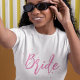 This design features bride wedding pink calligraphy script, chic modern elegant simple, a minimal minimalist dots fun, bridal shower bachelorette party gift, great for bachelorette weekend event celebration, for her feminine ladies girly, trendy stylish cute typography, minimal classic clean simplistic, simple graphic novelty keepsake, for the bride t-shirt