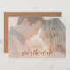 A soft blush overlay makes this simple, modern and effortlessly chic wedding photo save the date a nice choice for a fall wedding or for any couple with blush, soft pink, monochromatic beige or dusty pink colour schemes. A terracotta background on the back provide a nice contrast for the design.