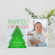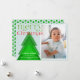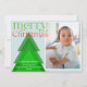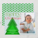 Simple modern Christmas Card with a single photo framed in a white border on a pale ice blue background. A simple geometric Christmas tree with blended shades of green adds a unique detail. A bright green and red "merry Christmas" in a shapely font with a few festive flourishes. Personalize with a brief message and your names, and the year. The back of the card features a tree pattern in a matching colour scheme.