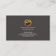A simple retro design. Card is divided into halves of grey and black. A white line demarcates these two columns. In the centre is a square gold motif of a home scene. Your name and job title are at the top followed by the business name and contact details at the base.