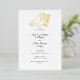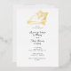 Simple Seashells in gold foil with calligraphy and classic fonts on simple front invitation. Reverses to watercolor sandy beach texture with earthy brown tones. This version has a conch shell at the top.