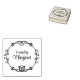 This custom "Created by" rubber stamp features a flower frame with a custom name.