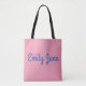 A cute modern simple design of your name in a fun typography style in cobalt blue on a millennial pink background.