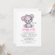 Custom baby shower invitation featuring a cute teddy bear / bear cub, trimmed in girly pink.