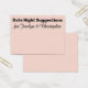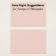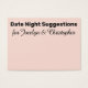 Here's a fun accessory to pick up for your engagement party or joint shower: date night suggestion cards on which guests can write personal notes to the bride and groom. On the front you read "Date Night Suggestions" in a bold, sans-serif font; this typeface is editable so you can choose another if you prefer... or even write a different message. Below there's a place for your names; these appear in a pretty script that is also easy to change. Change the background to any colour you prefer!. Please do not hesitate to reach out to me if you have special requests or need other items. I am also happy to help with customization of these cards if you need. //