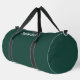 This deep green duffle bag has text in white script. The text can be edited or deleted.