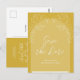 Unique yet beautiful way to send invites to friends and loved ones. This wedding invitation postcard has an arch style and features a floral design. The back of the card has your wedding announcement along with space for the recipient's name and mailing address. Shown in gold (front and back). Just change the text to suit your needs. Use the template to personalize.