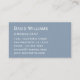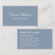 The background is dusty blue, the text is white. On the front, the name is written in an elegant calligraphic script. The rest of the text is in caps.