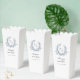 A simple modern wedding popcorn favour box design in white featuring a leafy wedding crest in dusty blue surrounding the bride and groom's monogram initials. With classic simplicity, this design features beautiful script typeface for the bride and groom's names and traditional serif typeface for the date. Personalize the text. If you need to reposition the monogram initials to adjust the centring, select "edit using design tool" after personalizing. This will open the full Zazzle edit and allow you to see the layers of the design and click and drag your initials into place as needed.