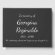 This simple and elegant funeral or memorial guestbook features a dark grey background, along with text in white script. It features a personalized name, birth/death years, and a customized message.