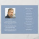 Programme funéraire moderne / dépliant funéraire avec un design simple mais élégant. Le recto comprend une photo du défunt ainsi que son nom, sa naissance et sa date de décès. L'intérieur a une deuxième image avec deux en-têtes et deux modèles pour la nécrologie et l'ordre de service. La palette de couleurs est bleu poussiéreux et peut être modifiée dans l'outil d'édition de conception. Ce programme peut être utilisé pour des funérailles, un service commémoratif ou la célébration de la vie. REMARQUE : L'option papier par défaut sélectionnée est "mat" et c'est la meilleure option si vous commandez ce programme plié.