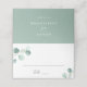 Elegant wedding place card with a simple design featuring watercolor painted eucalyptus greenery in the upper left corner and lower right corner. Below are lines for writing your guests' names and table number. The backside has your names and wedding date over a matching shade of medium sage green. These rustic botanical wedding place cards with a modern twist are perfect for a spring or summer wedding.