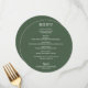 A round dinner menu card on evergreen (or any colour) and chic lettering in white displays your menu choices. Perfect for a holiday Christmas party or any special event with a sit down dinner menu. Choose ANY COLOR BACKGROUND, any COLOR TEXT, any FONT! Easily personalize with your dinner menu and details.