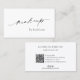 Modern business cards featuring a simple and minimal black and white design with "makeup" in an elegant calligraphy along with your name on the front. The back has your contact info along with social media icons and an optional QR Code in a minimalist layout. The QR Code may be removed and the social media icons may be changed or removed in the design editing tool.
