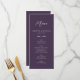 This modern, minimalist fall wedding reception menu card offers a simple clean layout on a dark purple background. The design offers space for you to add your wedding reception menu items along with the names of the bride and groom and their wedding date.