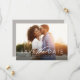 A simple but elegant save the date card to announce your engagement and upcoming wedding. The single horizontal photo features white text at the bottom with plenty of room for names and big day details. The back is a soft grey with a subtle stripe pattern. The colour can be changed by clicking "customize further."