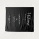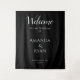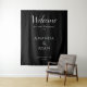Simple Elegant Welcome Script Wedding Backdrop Banner. Simple design with trendy script in white colour on a black background. Personalize all the text on the banner, bride and groom names and the wedding date.