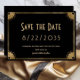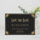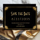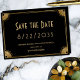 Le devant de cette carte postale de sauvegarde de mariage floral art déco élégant et simple comporte une typographie vintage script et sans serif en véritable feuille d'or sur fond noir, entourée d'une bordure minimale avec des fleurs rétro dans les coins, combinant sophistication et minimalisme. Le dos est un noir uni minimal. Vous pouvez personnaliser le texte en modifiant le modèle de produit pour personnaliser cette carte pour votre propre mariage.