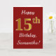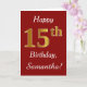 Ce simple design de carte d'anniversaire comporte le message "Joyeux 15ème anniversaire", avec le "15ème" ayant une apparence fausse or. Il comporte également un nom personnalisé et un arrière - plan rouge foncé. Il pourrait être donné à quelqu'un qui célèbre son quinzième anniversaire.