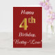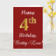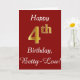 Ce simple design de carte d'anniversaire comporte le message "Joyeux 4ème anniversaire", avec le "4ème" ayant une apparence fausse or. Il porte également un nom personnalisé et un arrière - plan rouge foncé. On pourrait le donner à quelqu'un qui célèbre son quatrième anniversaire.