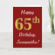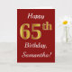 This simple birthday card design features the message "Happy 65th Birthday", with the "65th" having a faux gold-like appearance. It also features a personalized name, and a dark red background. It could be given to somebody who is celebrating their sixty fifth birthday.