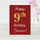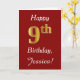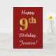 Ce simple design de carte d'anniversaire comporte le message "Happy 9th Birthday", avec le "9th" ayant une apparence fausse or. Il comporte également un nom personnalisé et un arrière - plan rouge foncé. Il pourrait être donné à quelqu'un qui célèbre son neuvième anniversaire.