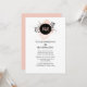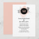 Minimalist wedding invitation, done in white with a splash of blush peach watercolor, at the top, with a simple black floral decoration. A black disc text area has the bride and groom's initials in peach. The back is done in a solid blush peach. Personalize the custom text for your special day.