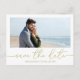 An elegant simple save-the-date wedding card with a modern elegant engagement engaged couple photo picture couple, with a scannable QR code for website online information and more details, a stylish trendy typography font text, a golden neutral budget friendly postcard, a minimal save our date card, a creative stylish calligraphy script, a simplistic elegance save-the-date, a simple modern border photo cards, a modern save the date cards, a casual modern save the date