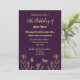 Unique simple birthday party invitation featuring romantic and elegant gold flowers and butterflies on purple background