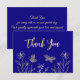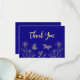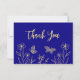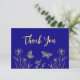 Unique simple wedding thank you card featuring romantic and elegant gold flowers on royal blue background