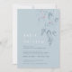 Modern simple sketched drawing and watercolor vertical fall wedding invitation in shades of dusty blue with white highlights and red purple berries
