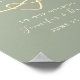 Elegant, modern, minimalist sage green wedding welcome poster with faux gold rope heart and simple handwritten calligraphy script.